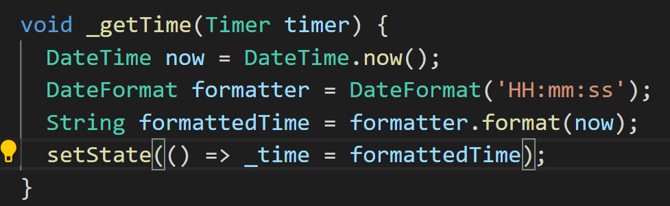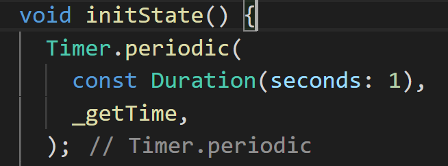 initState에서 1초마다 _getTime 메소드를 호출해주기 위해서 Timer클래스의 periodic메소드에 Duration을 1초로 하여 함수를 전달해 주고 있습니다.