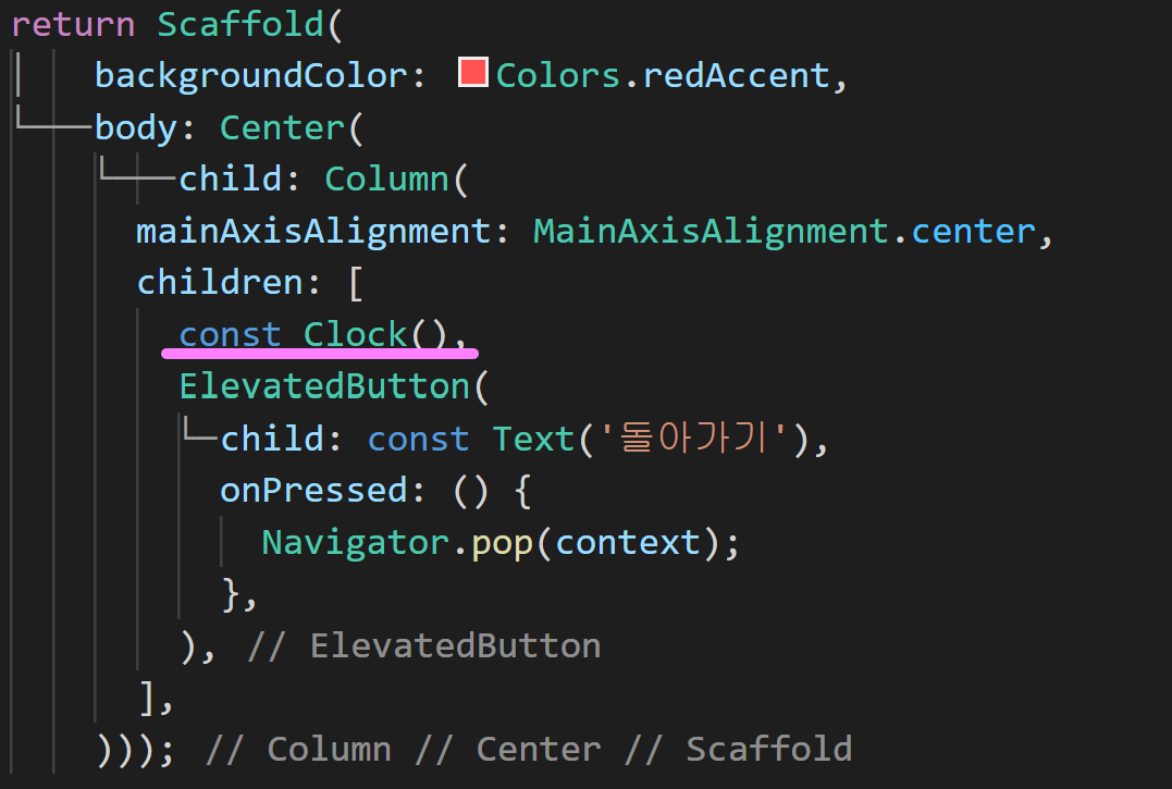 clock은 1초마다 텍스트가 갱신되어야 하므로 Statfulwidget으로 만들어 주었습니다.