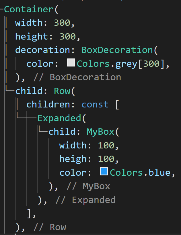 child의 위젯은 가로 100이지만 부모의 요소인 300만큼 확장된 걸 볼 수 있습니다. 또 하나 특이한 사항은 가로로만 확장되었다는 건데요. Row나 Column 중에 Expanded를 사용하는 경우 메인 축에만 영향을 받는다는 걸 알 수 있습니다.