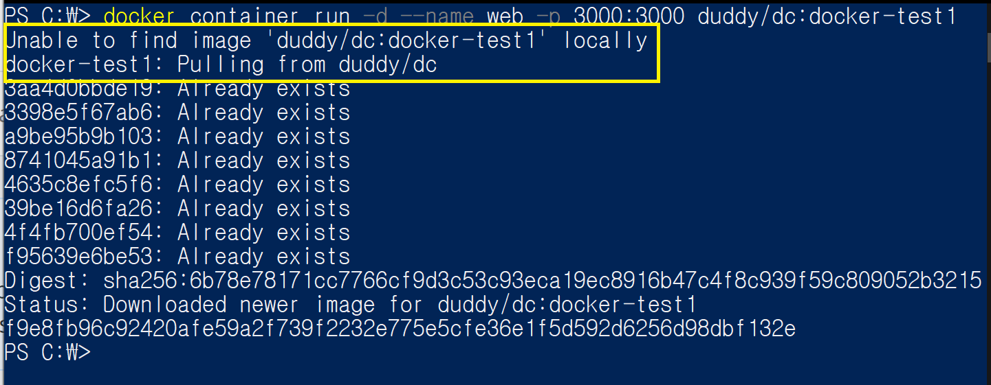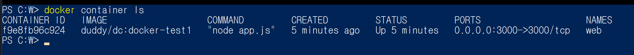 docker container run -d --name web -p 3000:3000 duddy/dc:docker-test1