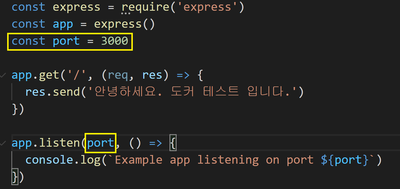 컨테이너의 수신 대기 포트를 3000이라고 준 이유는 컨테이너에서 기동 할 앱의 포트가 3000에서 작동하기 때문입니다. 아래 코드가 컨테이너에서 기동 되는 앱이고 3000 포트에서 동작하는 걸 확인할 수 있습니다.