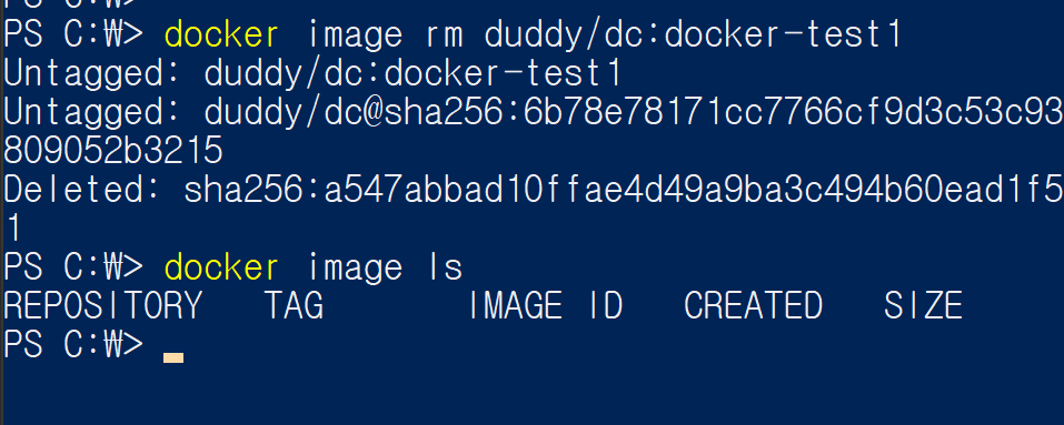docker image rm 명령어로 이미지를 삭제하였습니다.