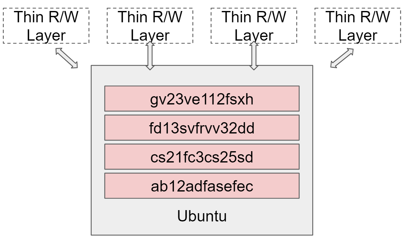 이미지에서 사용하고 있는 파일 계층은 디스크 공간 및 재사용 관점에서 효율적입니다. 우분투 이미지를 사용하여 여러 개의 컨테이너를 만든다면 이 이미지는 다른 컨테이너에서 공유될 것입니다.