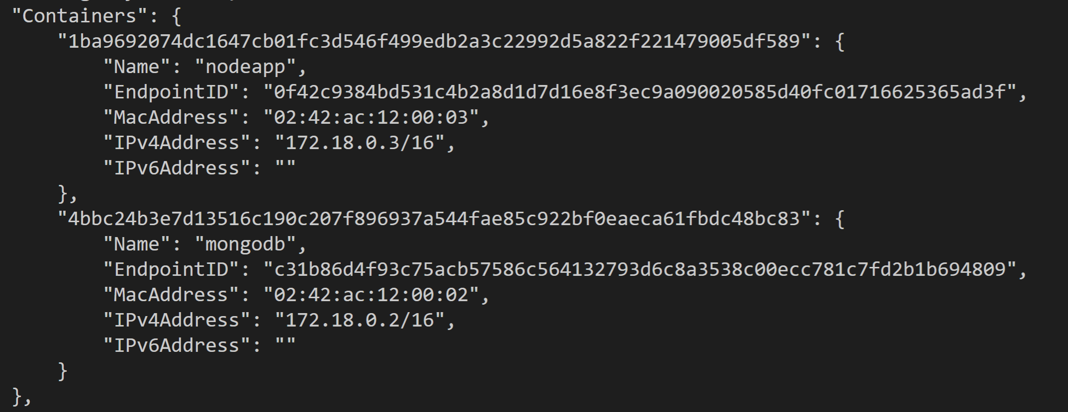 docker network inspect로 containers 부분을 살펴보면 아래와 같이 두 컨테이너가 설정돼있는 걸 확인해 볼 수 있습니다.