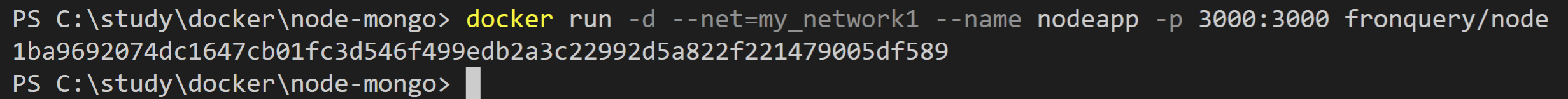 docker run -d --net=my_network1 --name nodeapp -p 3000:3000 fronquery/node