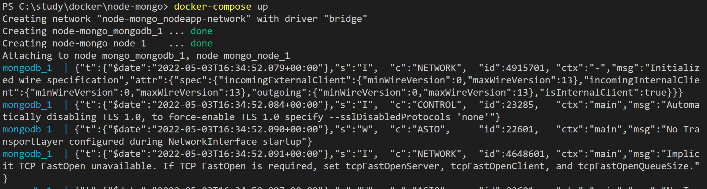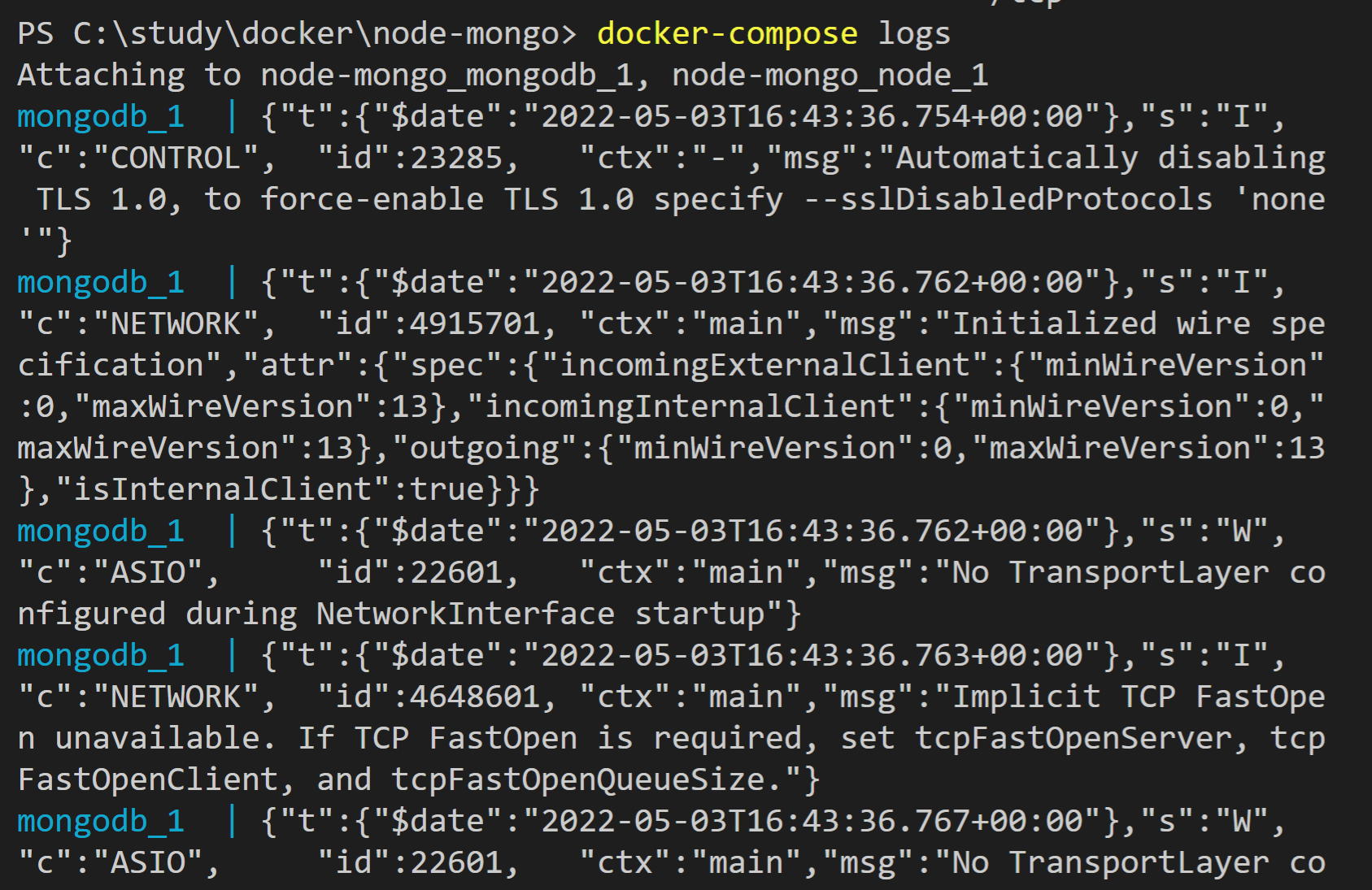 몽고 디비와 node, 두 컨테이너에 대한 로그가 동시에 출력됩니다.