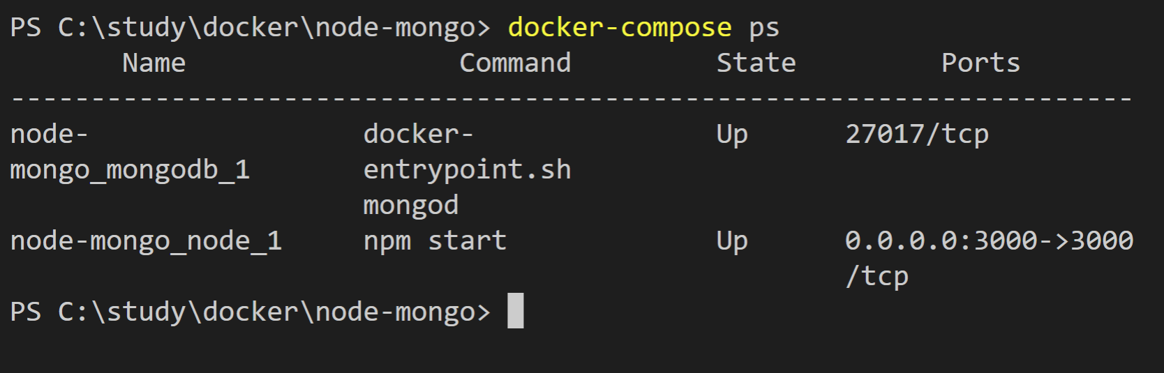 docker-compose ps로 실행 중인 작업을 살펴볼 수 있습니다.