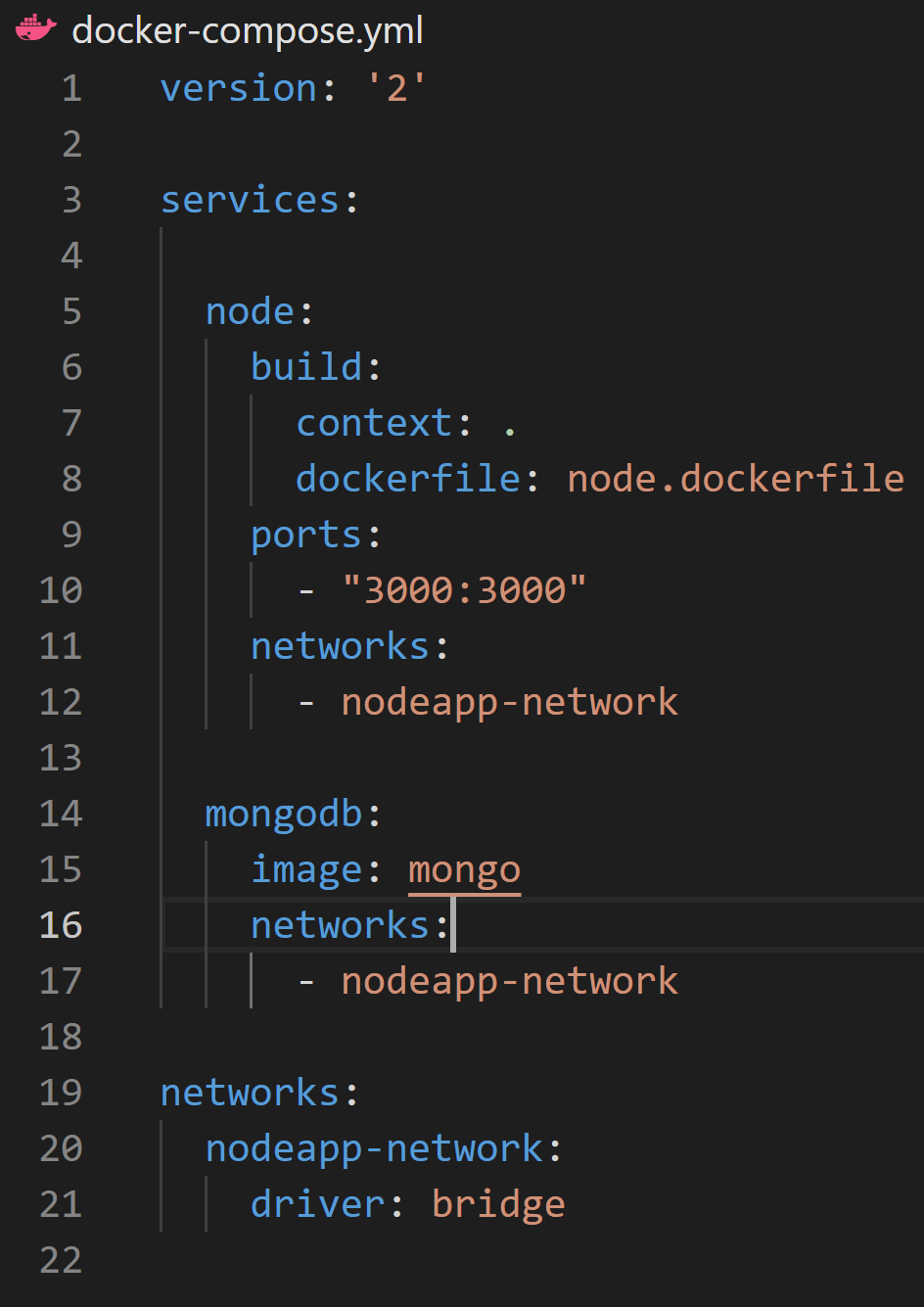 - 5번째 라인에서 몽고디비와 node 두 개의 서비스가 브릿지 네트워크에서 동작하길 원하기 때문에 "nodeapp-network"라는 이름으로 network를 넣어주고 있습니다.