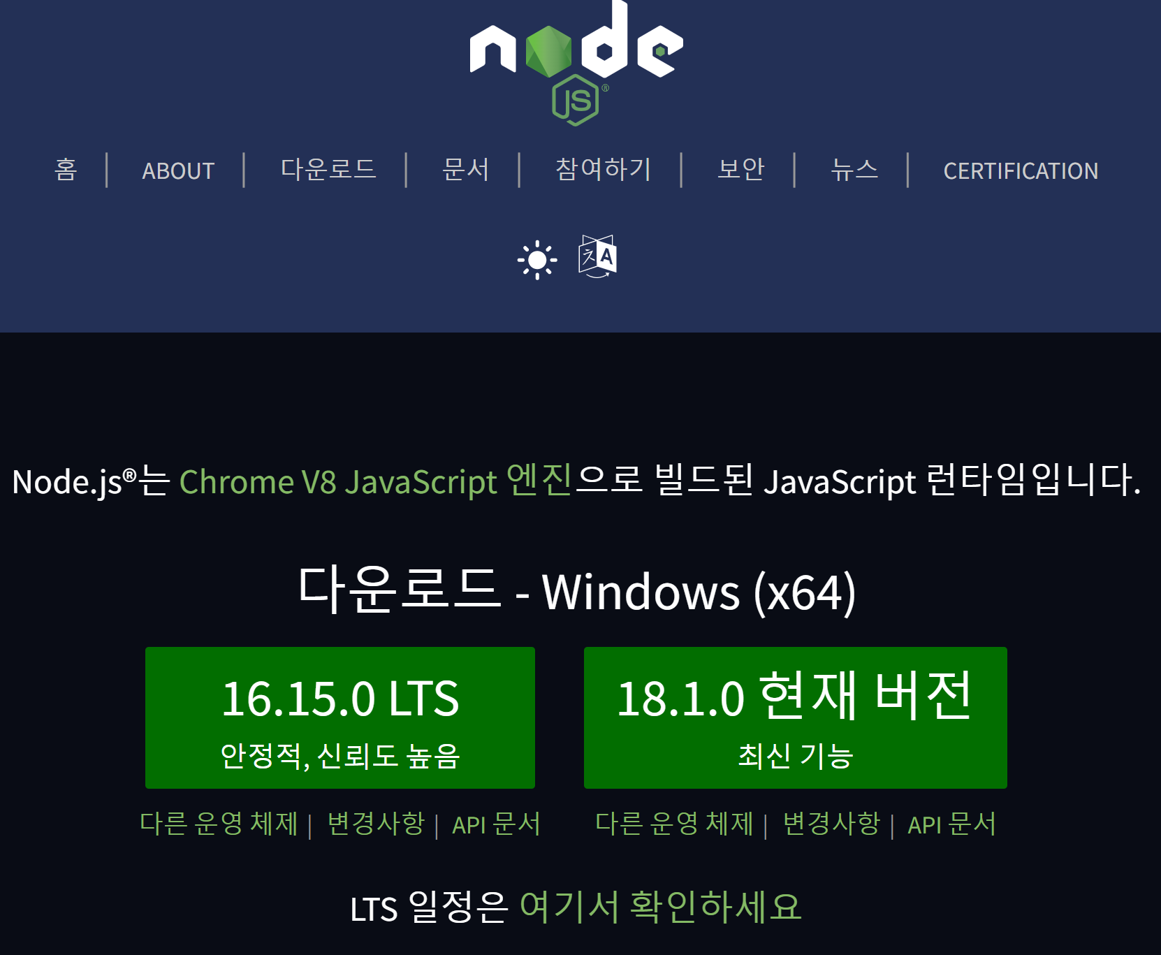 사이트로 들어가시면 LTS와 현재 버전 두 가지를 다운로드할 수 있는 링크가 나오는데, LTS(장기지원 버전)을 다운로드하여서 설치하는 것이 좋습니다. 설치하면 npm도 같이 설치됩니다. 이제 TypeScript를 설치할 준비가 되었습니다.