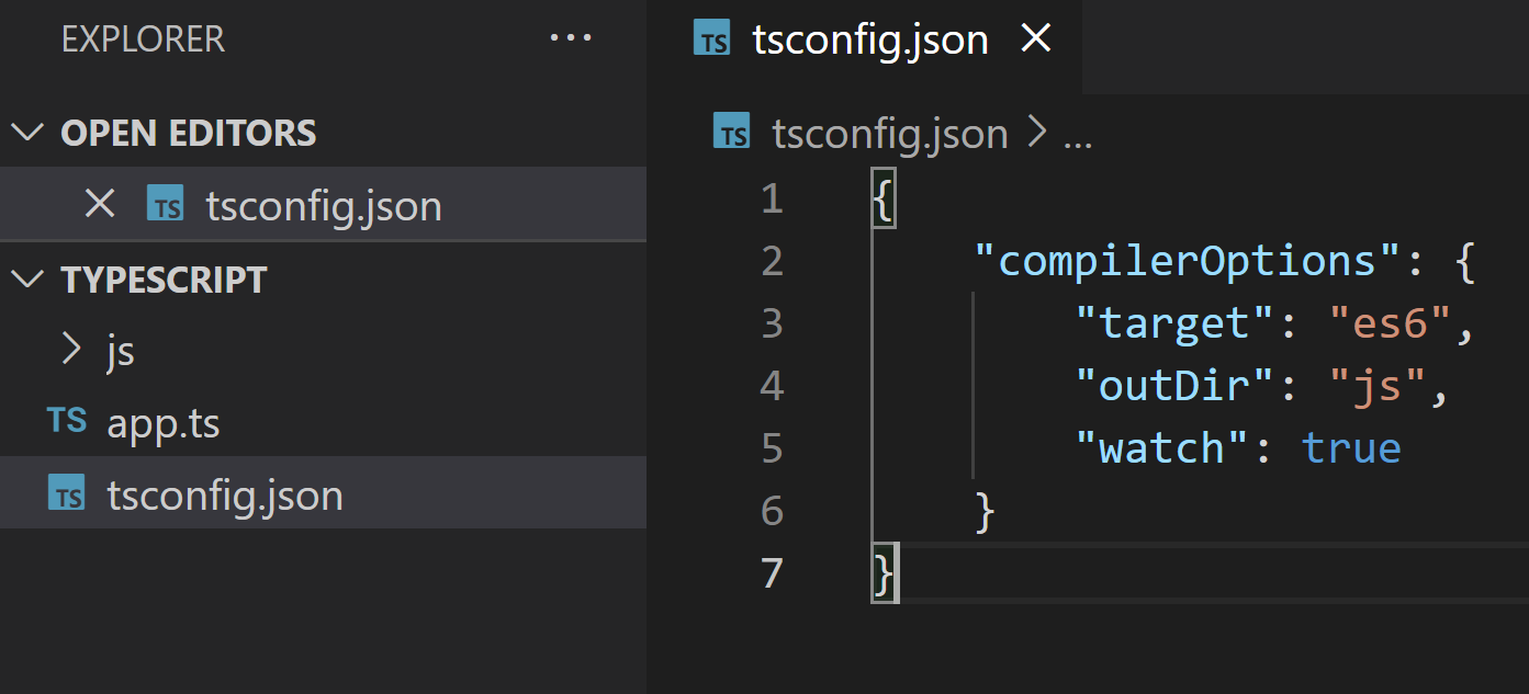 --target 옵션을 사용하면 컴파일러에서 생성할 Javascript 버전을 지정할 수 있습니다. es6라고도 불리는 ES 2015버전은 대부분의 최신 브라우저에서 사용이 가능하므로 es6을 설정해 주었습니다. 그런 다음 --outDir 옵션을 사용하여 컴파일러에서 생성한 JavaScript파일을 js라는 폴더에 넣도록 지정하고 있습니다. 마지막으로 오는 문자열 app.ts는 컴파일할 대상 파일입니다.