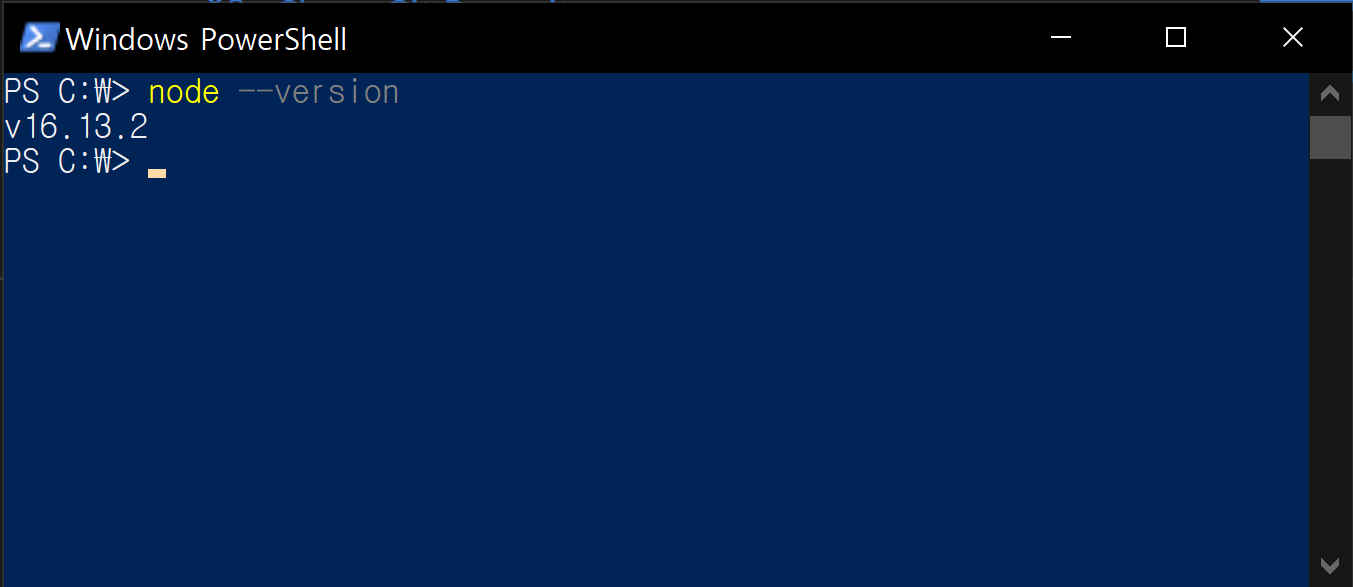 터미널을 열어주세요. 저는 파워쉘에서 실행했습니다. 이미 컴퓨터에는 Node와 npm이 설치되어 있는 상태입니다.