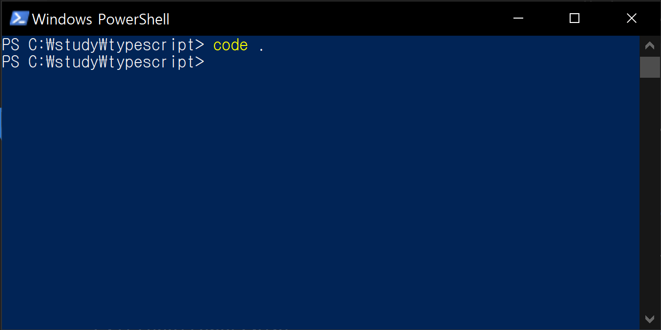 터미널에서 code .을 입력하면 현재 폴더 기준으로 VS Code가 실행됩니다.