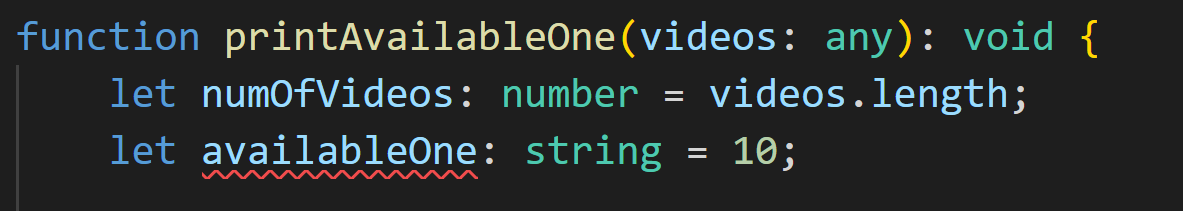 타입 스크립트가 타입 어노테이션이 버그를 조기에 잡는데 어떻게 도움이 되는지 보기 위해 availableOne에 숫자 10을 할당해 보겠습니다.