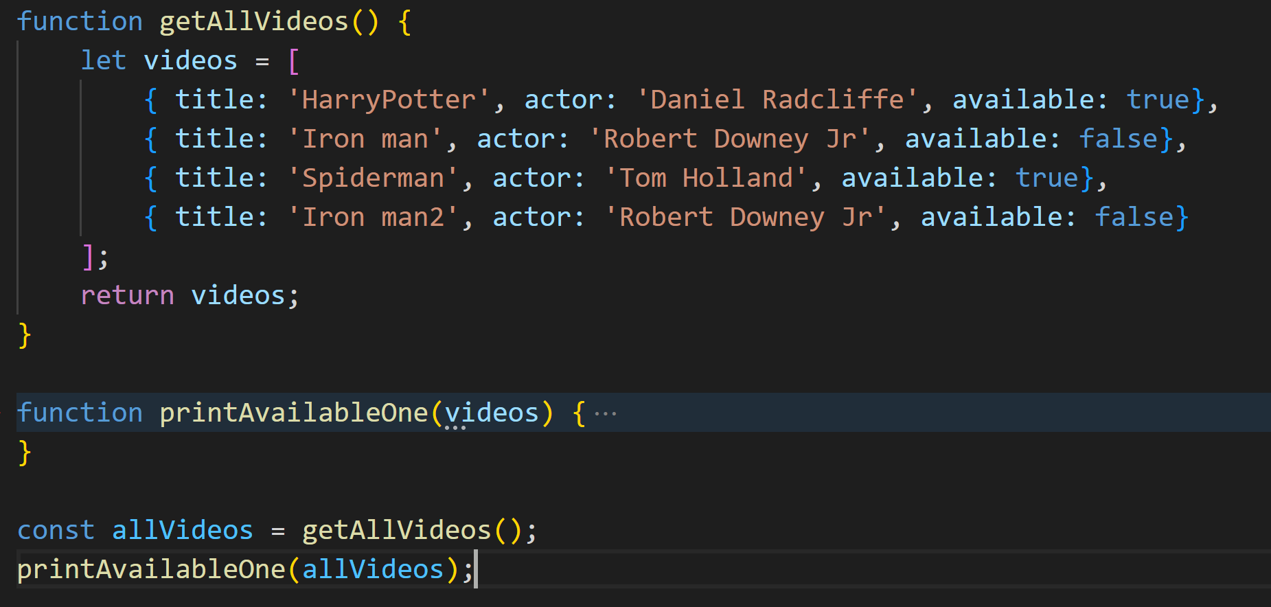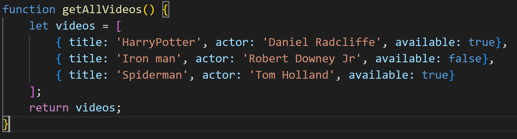 함수에 대해서는 차후 다른 포스트에서 다룰 예정이지만, 지금 위의 함수는 단순한 자바 스크립트 함수처럼 보이고 동작합니다. videos라는 변수를 선언하고 배열에 비디오를 나타내는 객체 리터럴을 넣어주고 있습니다. 제목과 배우 이름, 대여 가능 여부를 나타내는 세 가지 속성을 가지고 있습니다. 마지막으로 함수에서 배열을 반환해주고 있습니다. let으로 videos 변수를 선언했음을 주목해주세요. 블록이 함수 본문이고 함수의 맨 위에 선언했기 때문에 var로 선언한 것처럼 작동합니다.