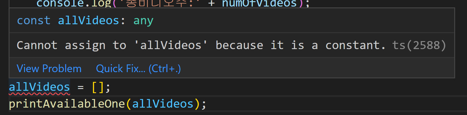 allVideos에 빈 배열을 설정하는 라인을 추가하였는데요. 다시 빨간색 밑선이 표시되었습니다. 마우스 오버해서 이유를 살펴보겠습니다.