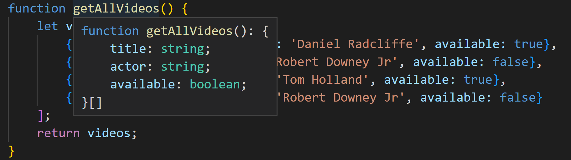 함수의 시그니처에 배열이 반환되고 객체는 title, actor, available이라는 세 가지 프로퍼티가 포함되어 있음이 표시됩니다. 타입 스크립트는 처음 두 개는 string이고 마지막은 boolean임을 올바르게 추론하였습니다.