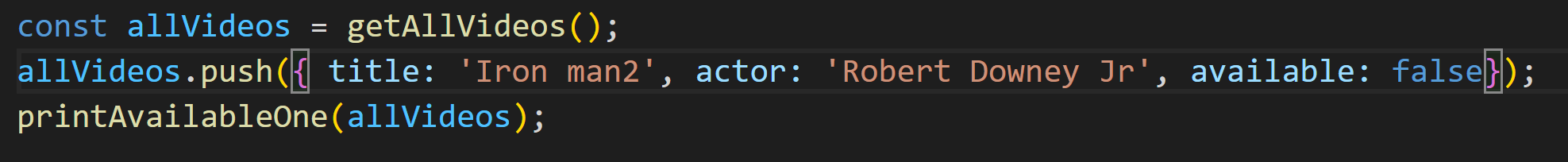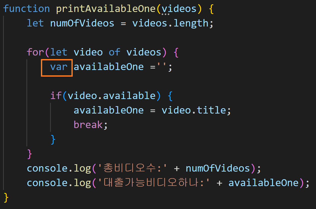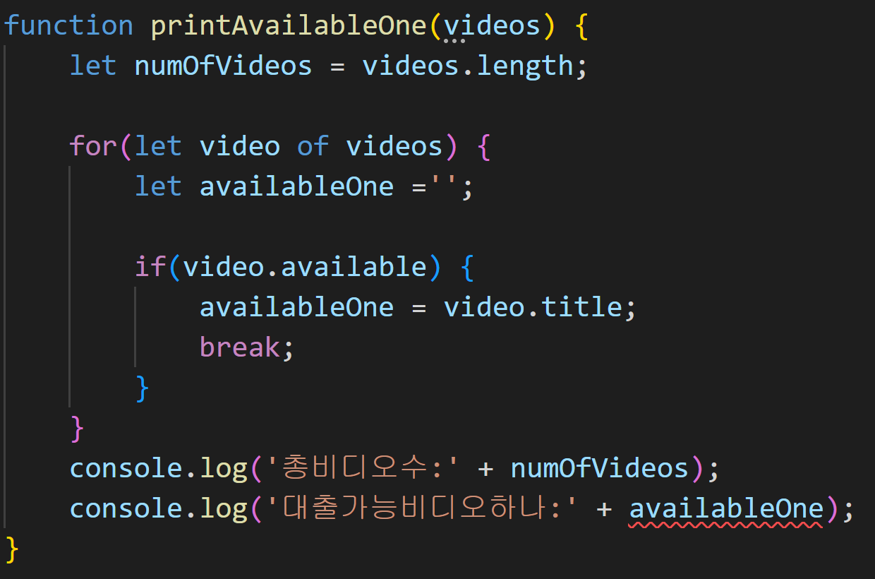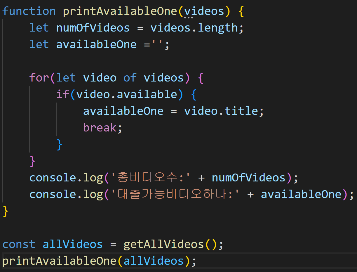 이제 for.. of 루프를 사용해서 available속성이 true로 설정된 첫 번째 비디오를 찾습니다. for... of 구문에서 video는 각 반복에서 검사 되는 비디오를 할당하는 데 사용되는 변수입니다. let으로 선언했기 때문에 for문 뒤의 중괄호로 정의된 루프 내에서만 사용할 수 있습니다. for의 if문에서 available이 true라면 availableOne에 제목을 할당하고 for 루프에서 빠져나오게 됩니다. 그러고 나서 총 비디오 수와, 대출 가능한 비디오 하나를 출력하고 함수가 종료됩니다.