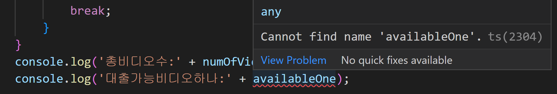 그런데 함수를 보면 VSCode에서 우리에게 뭔가 문제가 있음을 빨간 줄로 알려주고 있습니다. 빨간줄 밑줄이 나있는 변수에 마우스 오버를 해보면 팝업 메시지가 표시됩니다.