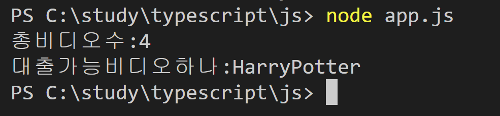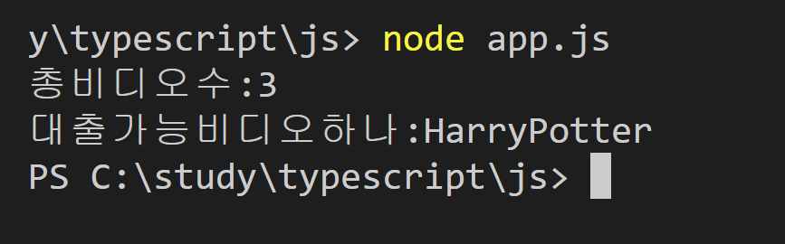 컴파일러가 JavaScript 출력을 저장하고 있는 js 디렉터리로 이동한 다음 node app.js 명령으로 프로그램을 실행하였습니다. 총 비디오수는 3개이고, 대출 가능한 비디오는 해리포터로 나오고 있습니다.
