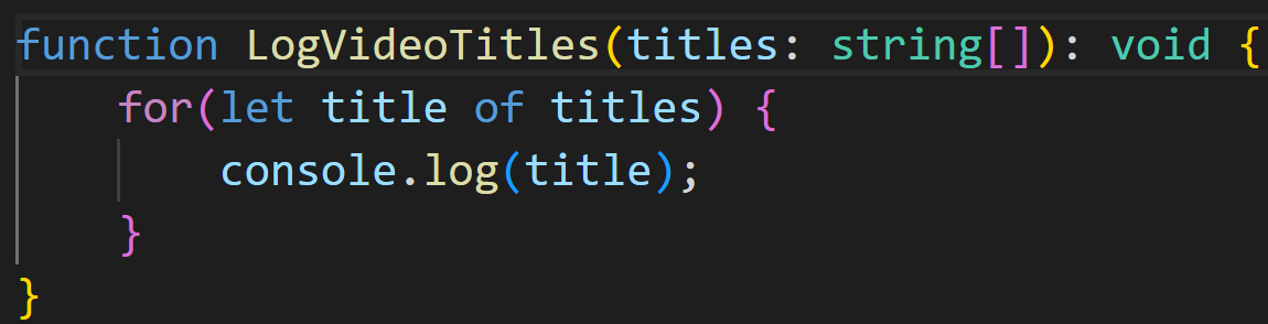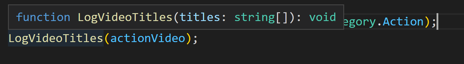 번외로 타입이 갖는 장점을 조금 더 살펴보겠습니다. LogVideoTitles에 마우스를 올리면 함수의 시그니처가 나옵니다.