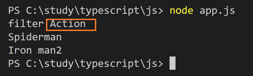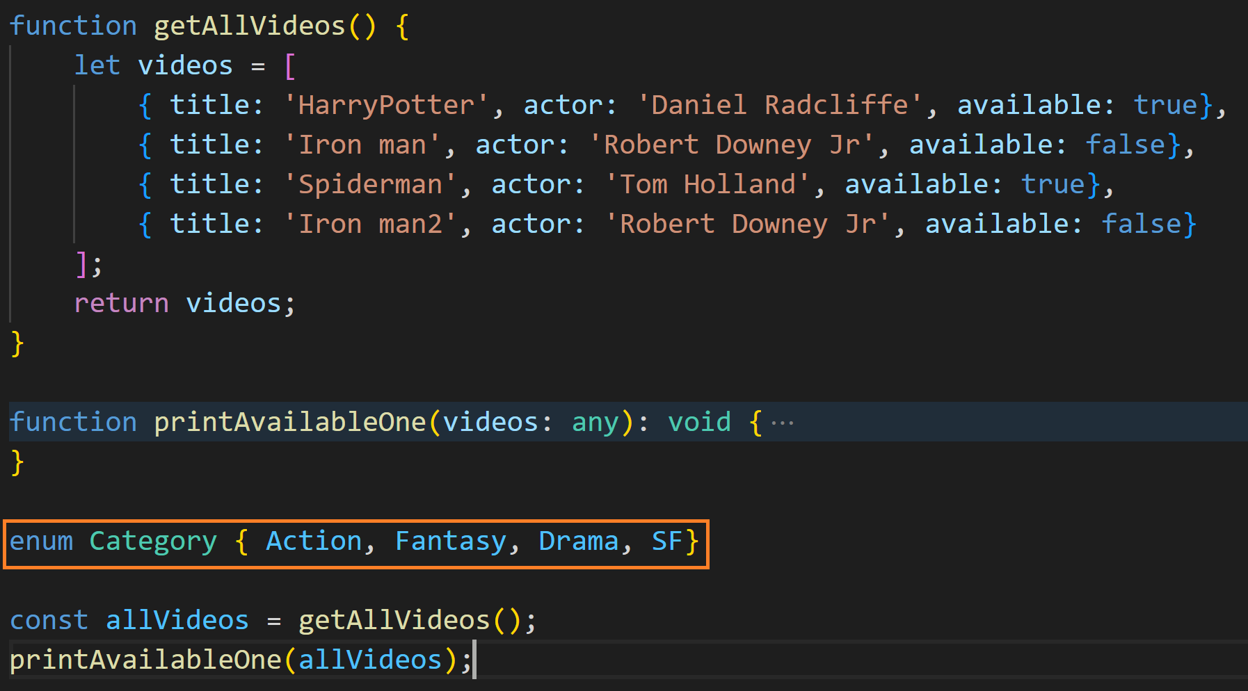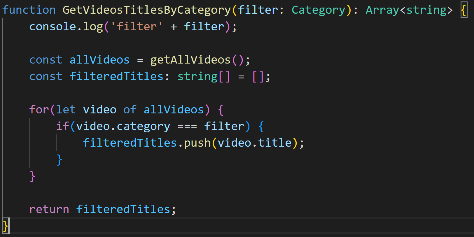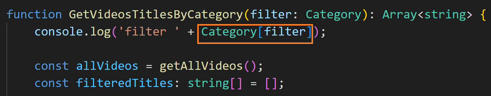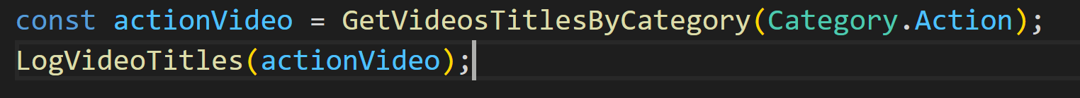 GetVideosTitlesByCategory 매개변수 이름을 filter로 하였고, 타입을 Category로 추가 하였습니다. enum으로 만든 Category를 타입으로도 쓸 수 있다는 점을 주목해 주세요. 이 함수는 비디오 제목의 배열을 반환해야 하므로 리턴 타임을 Array <string>으로 지정하였습니다.