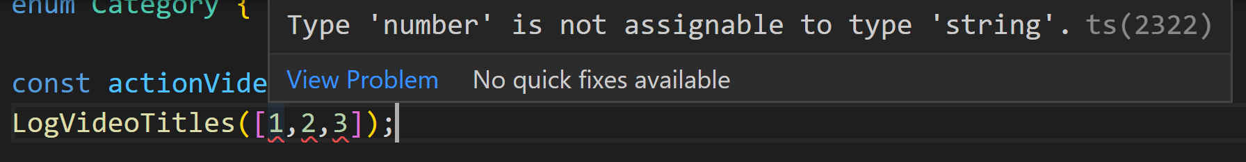 숫자 배열 리터럴을 건네주자 바로 빨간 줄이 가면서 string에 number를 할당할 수 없다고 에러를 표시해 줍니다. 규모가 큰 자바스크립트 프로그램에서는 이러한 종류의 실수를 하기가 너무 쉽습니다. 타입 스크립트를 사용하면 이러한 종류의 에러는 사전에 제거가 가능합니다.