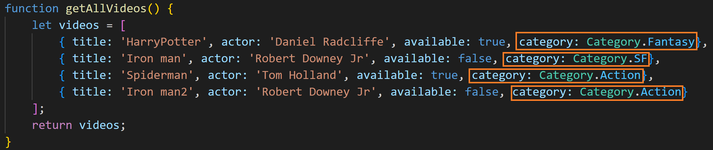 열거형을 정의했으므로 getAllVideos 함수에서 반환되는 videos 오브젝트를 편집하여 비디오 카테고리를 저장하는 새 속성을 포함하려고 합니다.