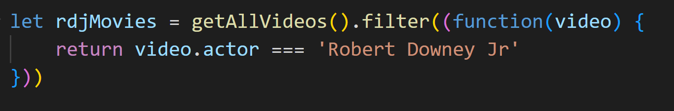 화살표 함수는 화살표 모양처럼 보이는 => 표시를 이용하게 됩니다. 화살표 왼쪽에는 함수에 대한 매개변수 video가 있습니다. 화살표의 오른쪽에는 함수의 본문이 있으며 위에서 썼던 동일한 동등 비교를 하고 있습니다. function 키워드나 함수의 중괄호, return 키워드를 사용할 필요가 없습니다. 결과는 같지만 익명 함수를 사용할 때 보다 훨씬 간결해 보입니다. 다른 언어에서 람다를 사용해본 적이 없다면 화살표 함수가 약간 이상하게 보일 거라 생각되는데요. 익숙해지면 화살표 함수로 코딩하는 것을 분명 좋아하게 될 것입니다. 기억해야 할 것은 화살표 왼쪽에 있는 모든 것이 매개변수이고 화살표 오른쪽에 있는 모든 것이 함수 본문이 된다는 점입니다.