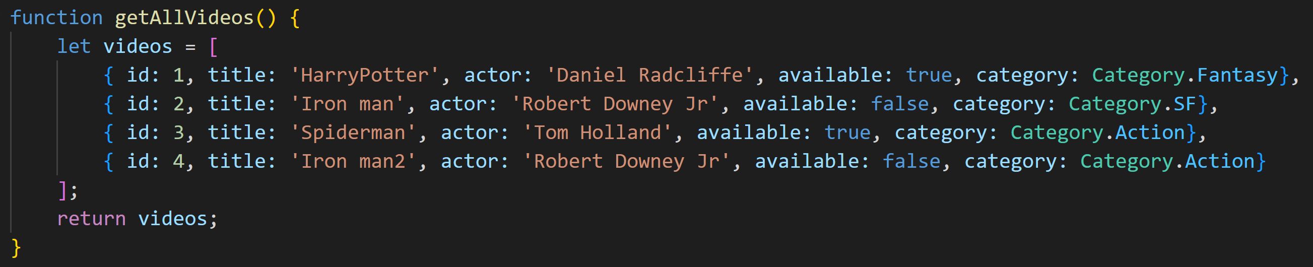 위의 함수는 비디오를 나타내는 객체 video 배열을 리턴하는 함수입니다. 비디오 객체에는 id프로퍼티가 존재합니다. 이제 특정 비디오를 id로 찾는 함수를 화살표 함수를 활용해서 만들어 보도록 하겠습니다.