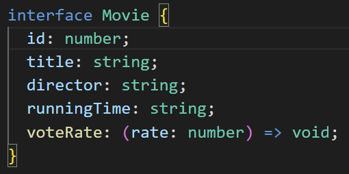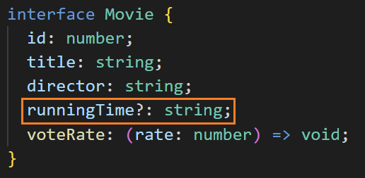 runningtime 프로퍼티 명 뒤에 물음표를 추가하여 선택적 프로퍼티로 바꿔주었습니다. 메서드에 이름과 서명을 지정하여 인터페이스에 메서드를 지정할 수 있습니다. Movie 인터페이스에는 number 타입 변수를 매개 변수를 사용하고 void를 반환하는 voteRate라는 메서드가 있습니다.