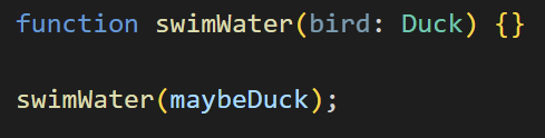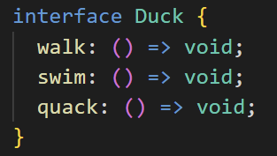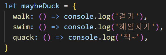 maybeDuck이라는 새로운 변수를 선언했습니다. 하는 행동을 보니 오리인 것 같은데 타입을 명시하지는 않았습니다. 그러나 이것은 walk, swim, quack이라는 이름의 메서드를 가진 개체이며, 이러한 메서드의 시그니처는 Duck 인터페이스의 시그니처와 정확히 일치합니다. 다음으로 Duck을 매개변수로 하는 함수를 정의하겠습니다.