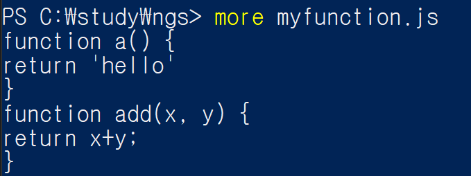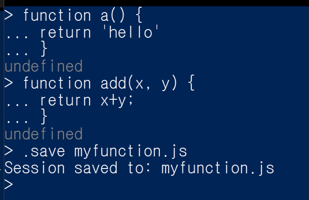 함수 a, 와 add를 만들었고, .save 명령어를 사용해서 myfunction.js파일에 저장해 주었습니다. myfunction.js파일을 확인해 보면 잘 저장된 걸 확인할 수 있습니다.