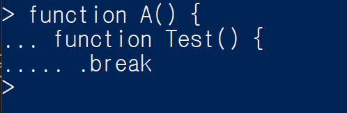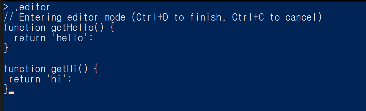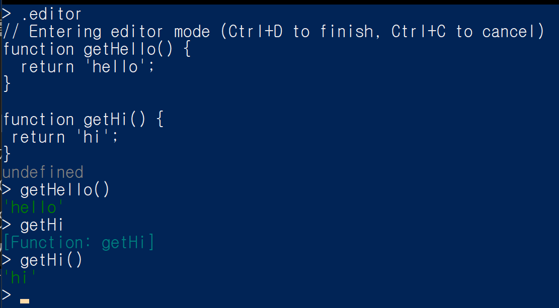 함수 바디를 작성하고 } 괄호를 닫아주면 node는 코드가 실행할 수 있다는 것을 알아차리고 다중 라인 모드가 종료됩니다.