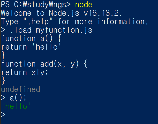 이제 .load 명령어를 사용해서 저장된 파일을 새로운 REPL 세션에서 불러와 보겠습니다.
