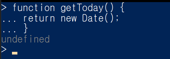 function getToday() { 까지 입력하고 에터를 누르면 …으로 표시됩니다. node가 라인이 아직 완료되지 않았음을 감지하고 다중 라인 모드로 전환됐다는 표시입니다.
