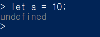 예를 들어 변수를 정의하고, 10을 할당했습니다. 그리고 enter를 누르면 undefined가 출력됩니다. 이것은 자바스크립트 명령문이기 때문입니다.