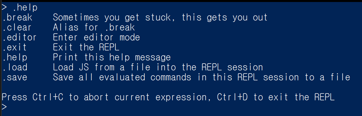 .help명령을 사용하면 REPL 명령의 목록을 확인할 수 있습니다.