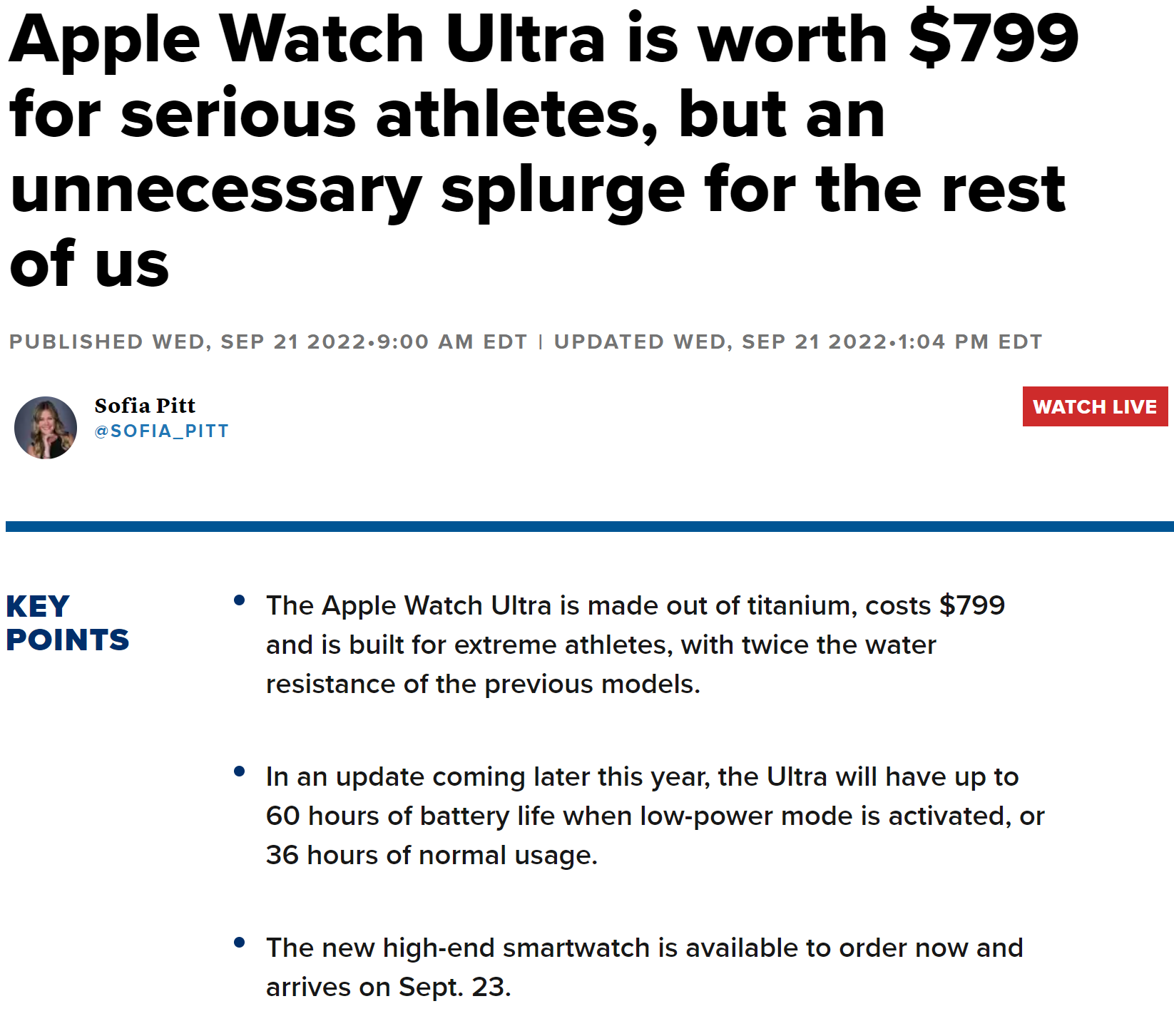 CNBC는 애플 워치 울트라는 본격적인 선수에게는 799달러 이상의 가치가 있다고 전했습니다. 하지만 그 이외의 일반 사람에게는 불필요하고 오버스펙이라고 지적했습니다. 하지만 애플 워치 울트라의 개선된 배터리 수명, 높은 내수성, 스쿠버 다이빙 컴퓨터, 재설계된 나침반 앱, 정확하게 위치를 추적할 수 있는 멀티밴드 GPS 등의 기능을 매우 뛰어난 업적이라고 평가했습니다.